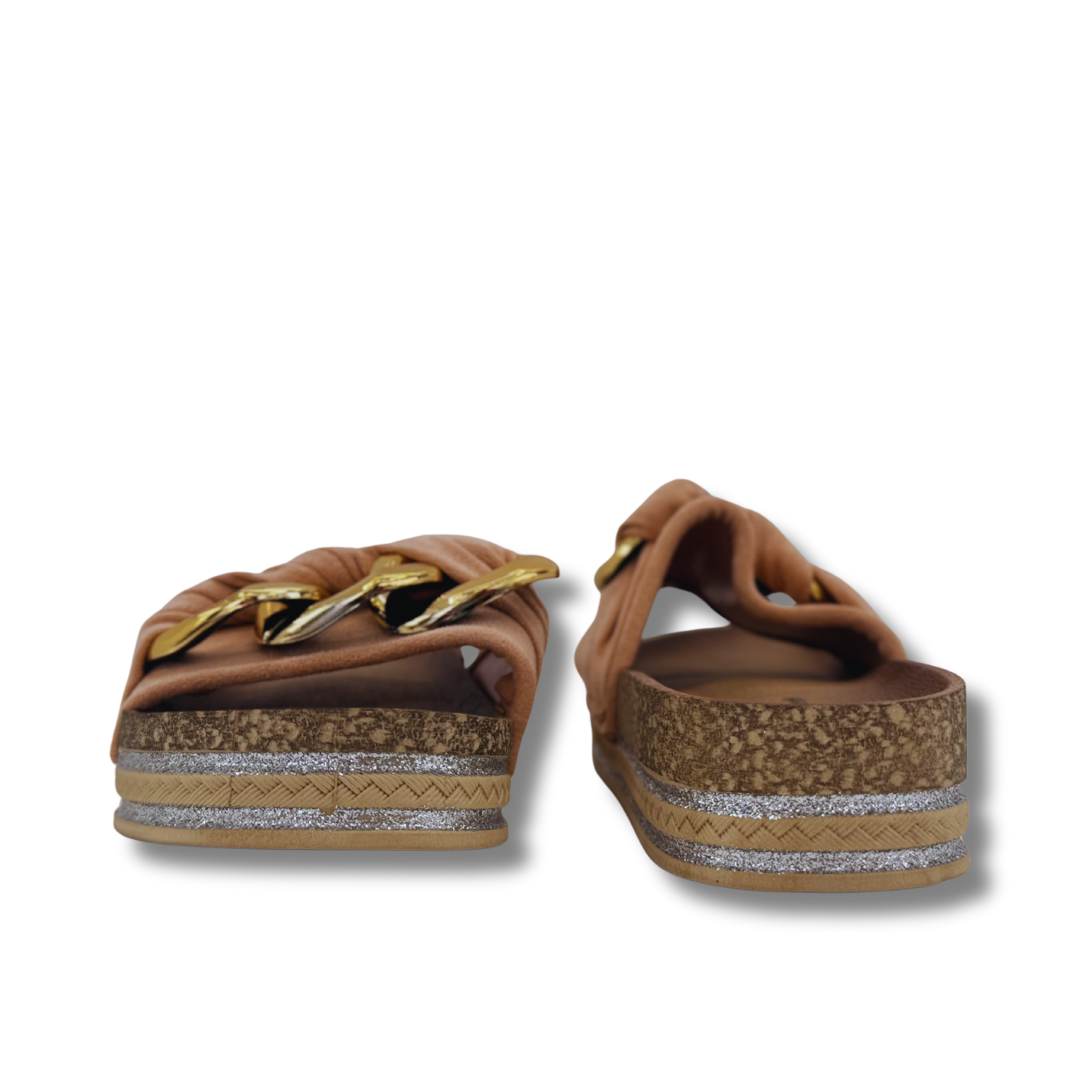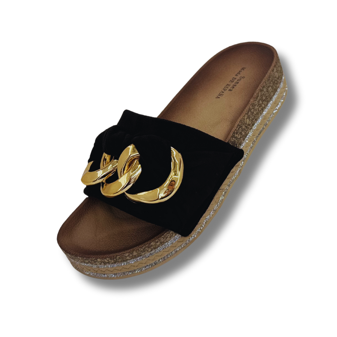 Dale un toque glamuroso a tu look con nuestras sandalias elegantes con cadena dorada. Su diseño combina lo clásico con lo moderno: una silueta plana, cómoda y ligera, decorada con aros dorados metálicos que realzan cualquier outfit.