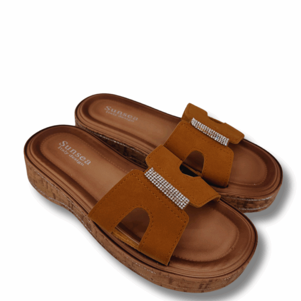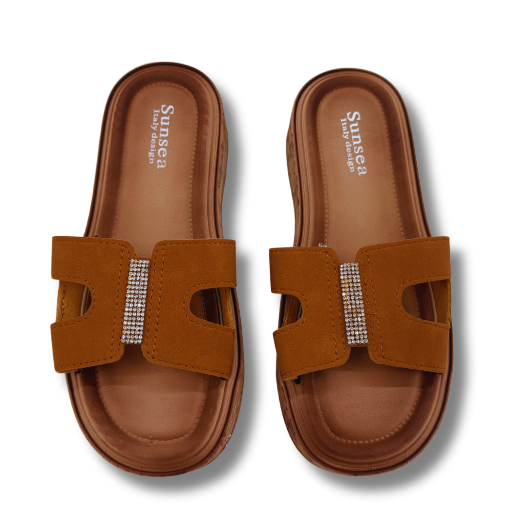 Su diseño atemporal se realza con detalles brillantes que aportan un toque sofisticado, ideal para lucir en verano tanto de día como de noche.